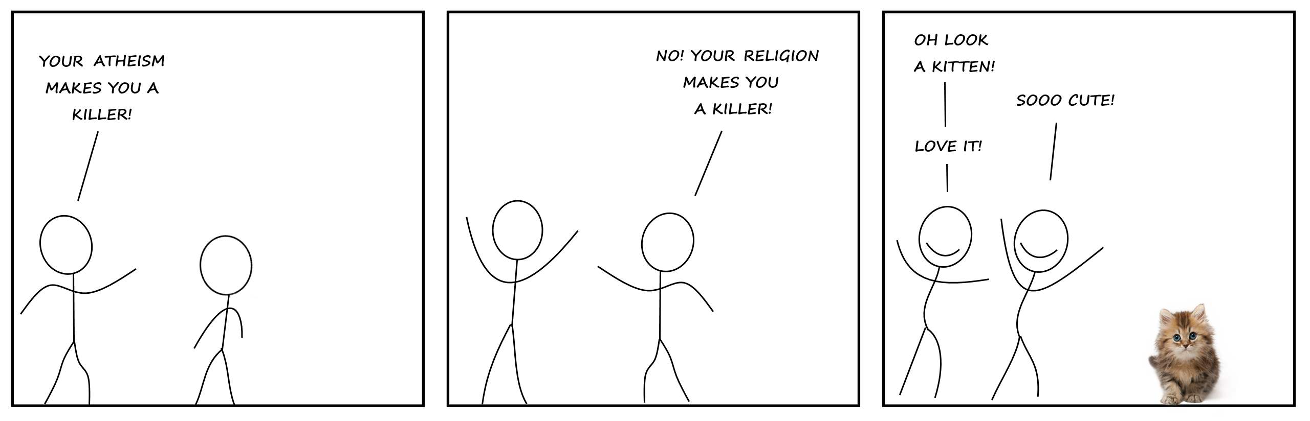 2. Before atheism was a thing, all violence in history was perpetrated by religious people, and there was lots of violence