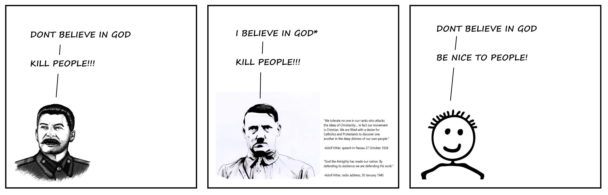 I want to acknowledge there were people that shared some of my beliefs about God who were also assholes. That’s right, I’m not going to sit here for 30 pages and turn blue in the face arguing “Stalin wasn’t a truly true atheist” as the apologists are prone to do when presented with examples of Christian fascists and psychopaths.As far as I can tell Stalin thought there was no God, something I also think.