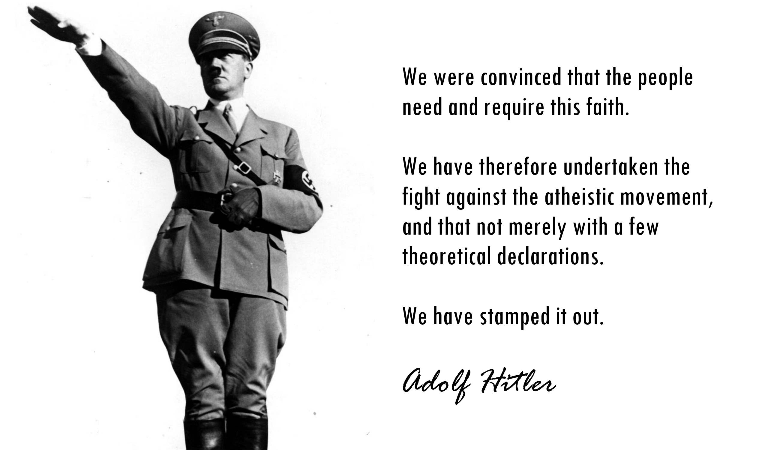 Whats more insightful is that every bit of hard evidence (film, autobiography, radio recordings, etc) shows us that Hitler constantly used Christian imagery to engage the Nazis to action. This highlights an important fact: Nazi fascism was not an atheist ideology, but lived almost exclusively in the minds of German Christians.