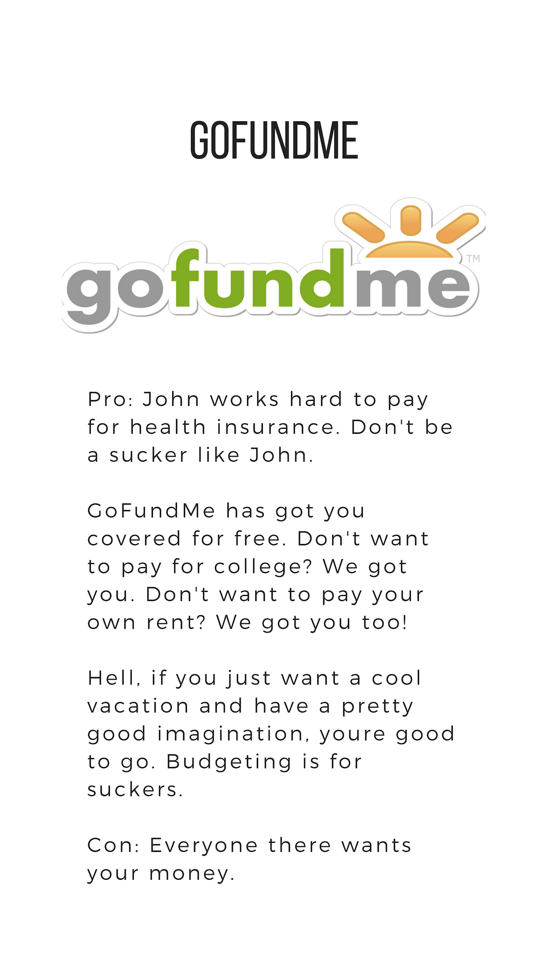 Pro: John works hard to pay for health insurance. Don’t be a sucker like John. GoFundMe has got you covered for free. Don’t want to pay for college? We got you. Don’t want to pay your own rent? We got you too! Hell, if you just want a cool vacation and have a pretty good imagination, you’re good to go. Budgeting is for suckers.