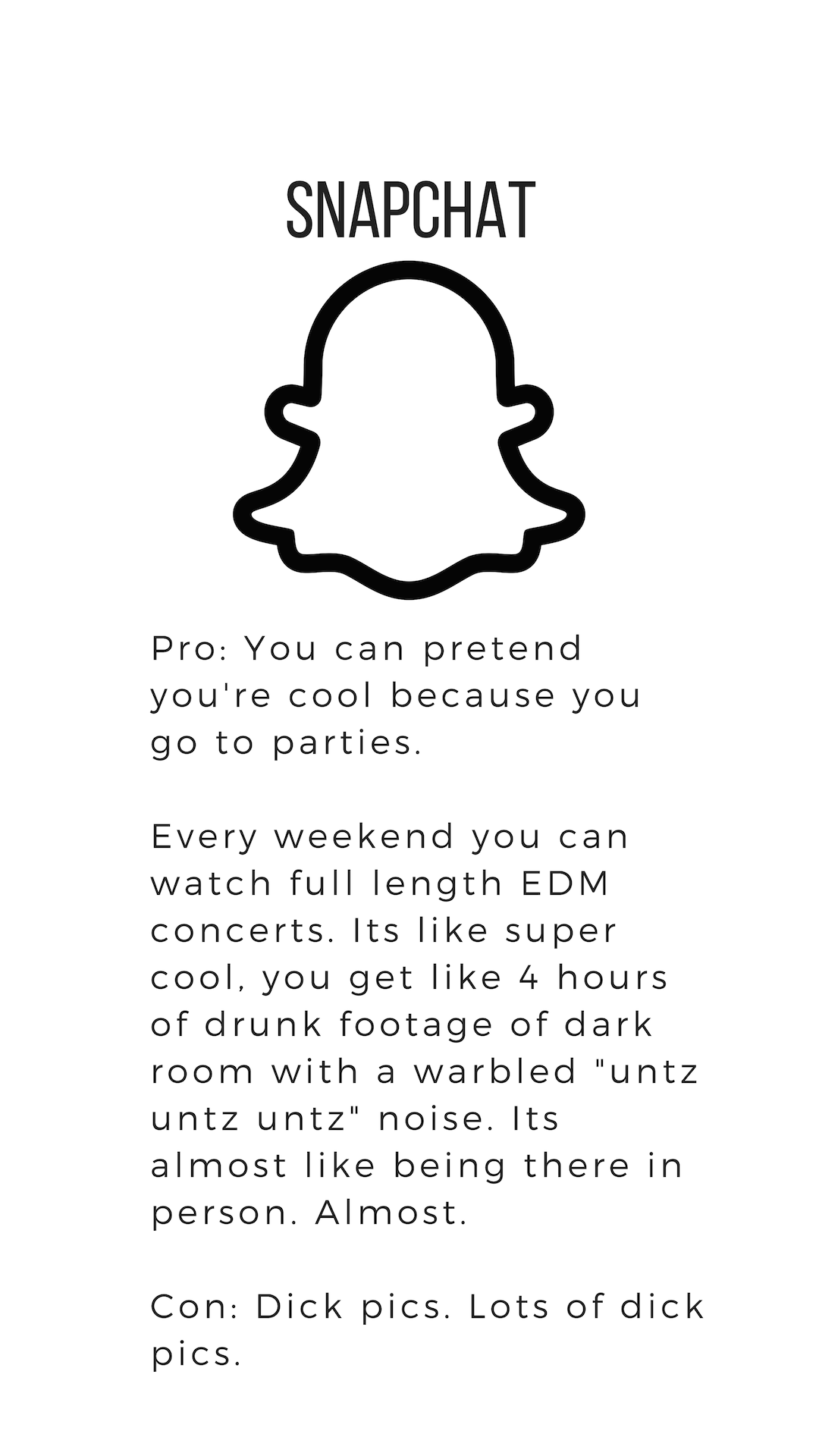 Pro: You can pretend you’re cool because you go to parties. Every weekend you can watch full length EDM concerts. Its like super cool, you get like 4 hours of drunk footage of a dark room with warbled “untz untz untz” noises. Its almost like being there in person. Almost.