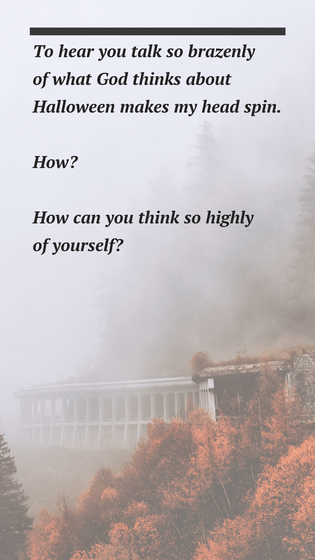 To hear you talk so brazenly about what God thinks about Halloween makes my head spin.