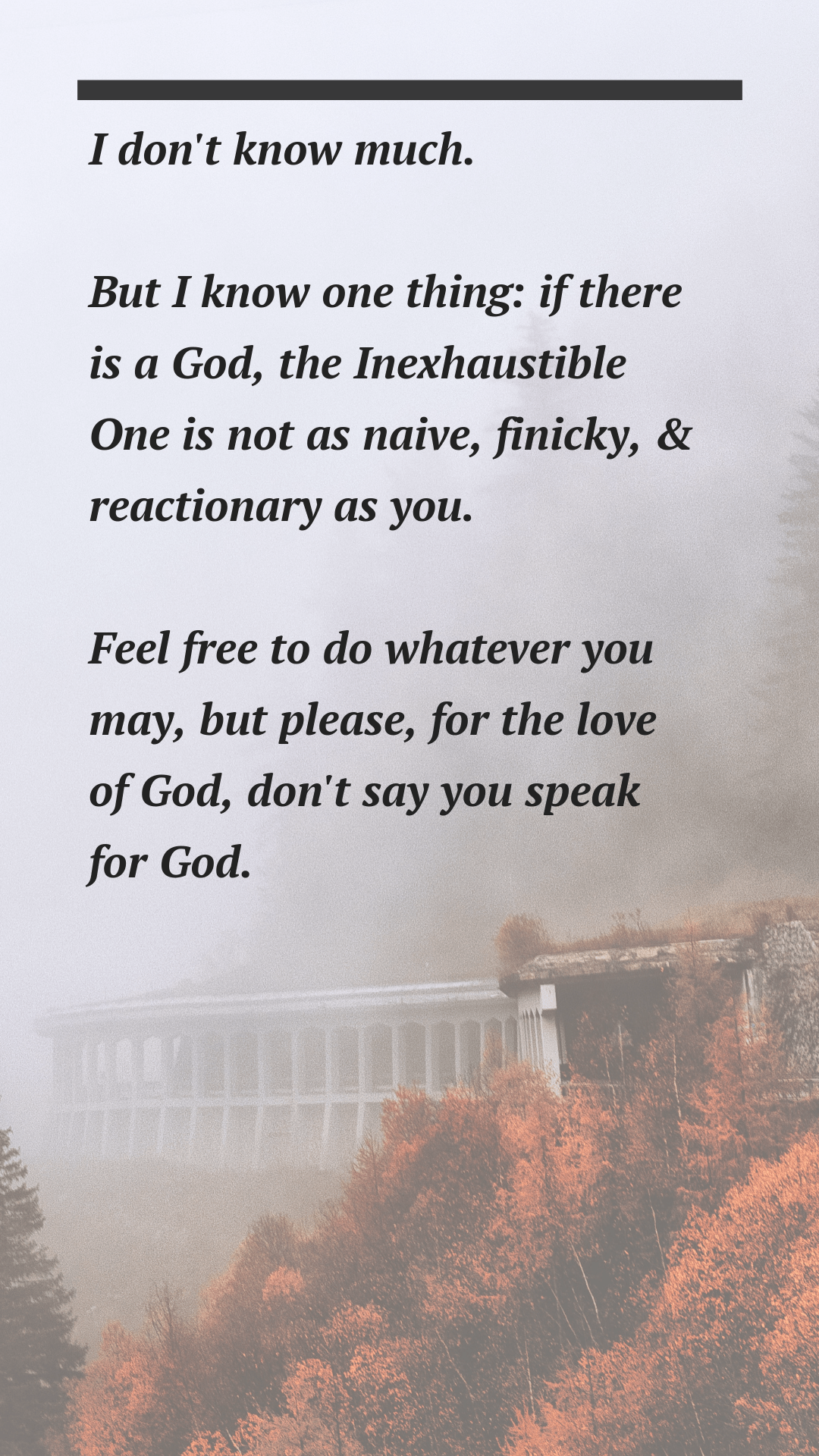I don’t know much, but I know one thing: if there is a God, the Inexhaustible One is not as naive, finicky, & reactionary as you.