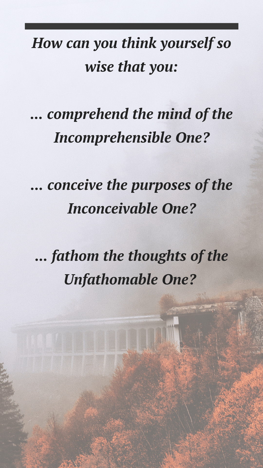 How can you think yourself so wise that you: … comprehend the mind of the Incomprehensible One? … conceive the purposes of the Inconceivable One? … fathom the thoughts of the Unfathomable One?