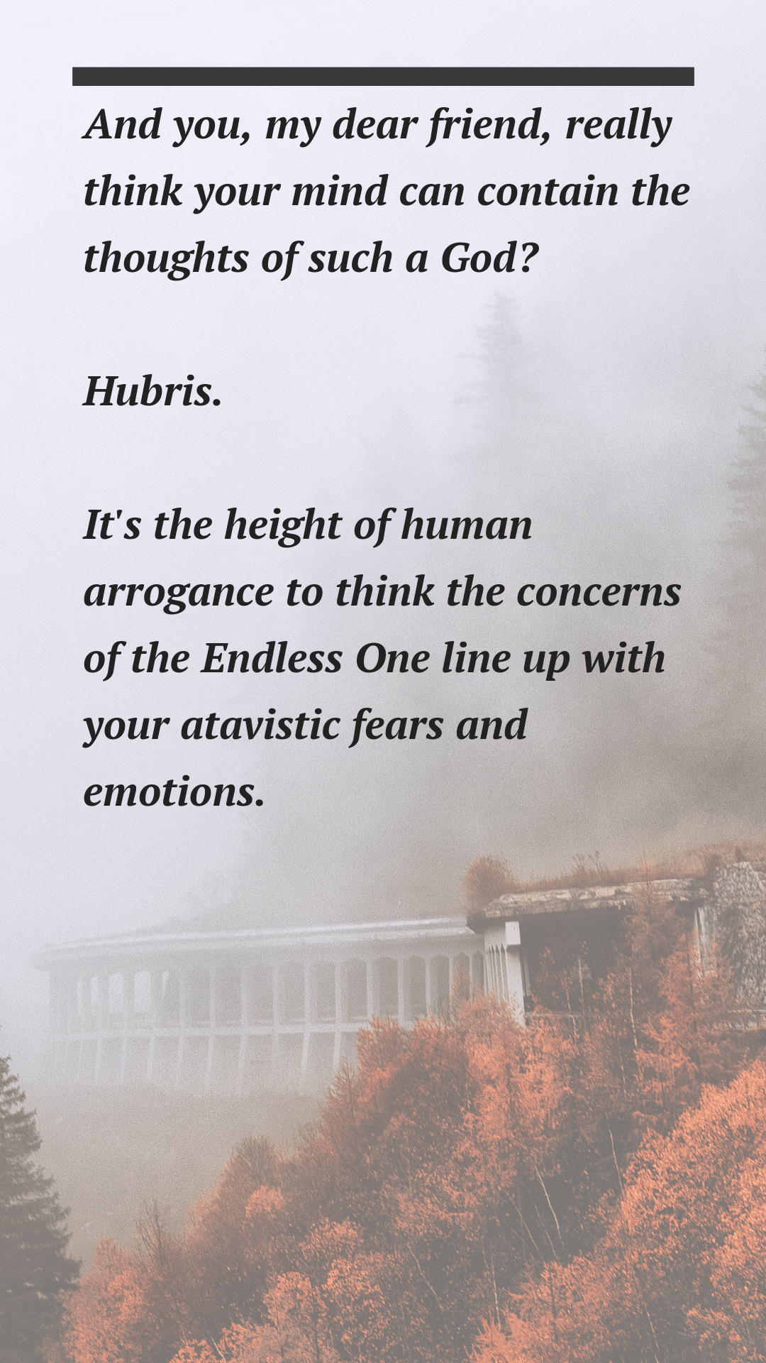It’s the height of human arrogance to think the concerns of the Endless One line up with your atavistic fears and emotions.