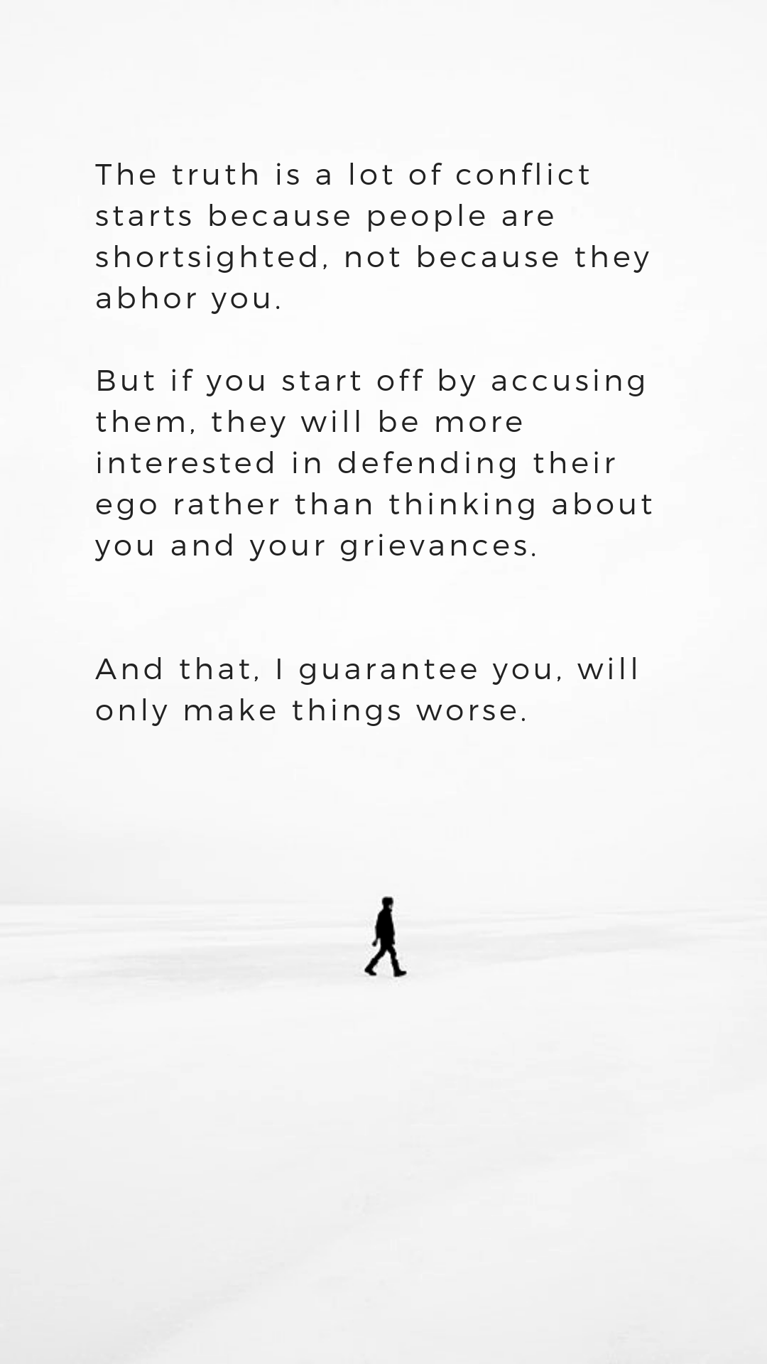 The truth is a lot of conflict starts because people are shortsighted, not because they abhor you. But if you start off by accusing them, they will be more interested in defending their ego rather than thinking about you and your grievances. And that, I guarantee you, will only make things worse.