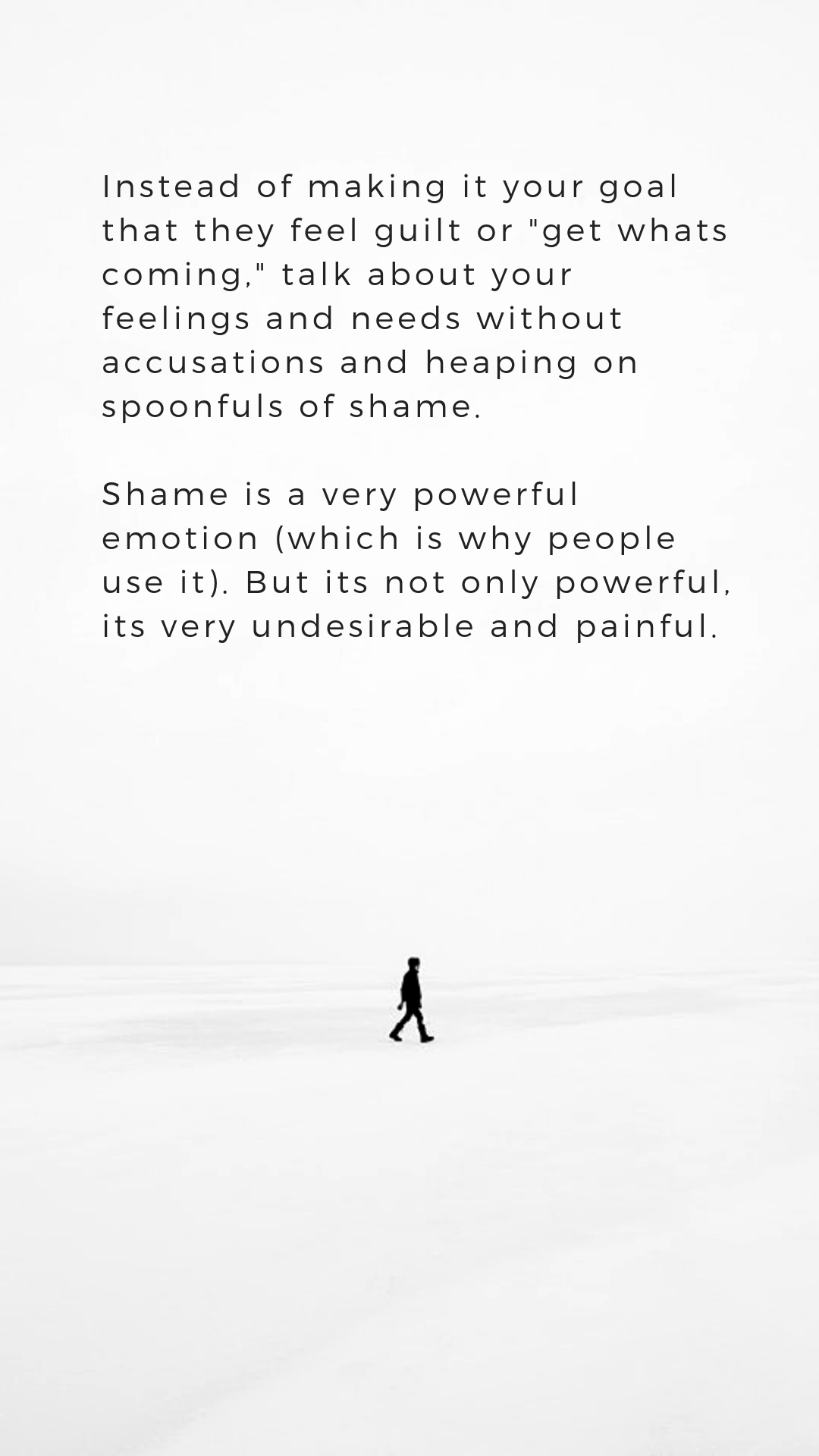 And while not every relationship can be saved, once conflict starts, in those that remain strong and healthy, participants follow a specific pattern. Instead of focusing on ways to blame the other person, simply explain that you feel hurt. Instead of making it your goal that they feel guilt or "get whats coming," talk about your feelings and needs without accusations and heaping on spoonfuls of shame.Shame is a very powerful emotion (which is why people use it). But its not only powerful, its very undesirable and painful. In one sense, trying to force someone to feel shame is a type of “emotional torture.” This is where the problem lies: the human ego is wired to be defensive, to impulsively protect itself from all pain, and that definitely includes shame.