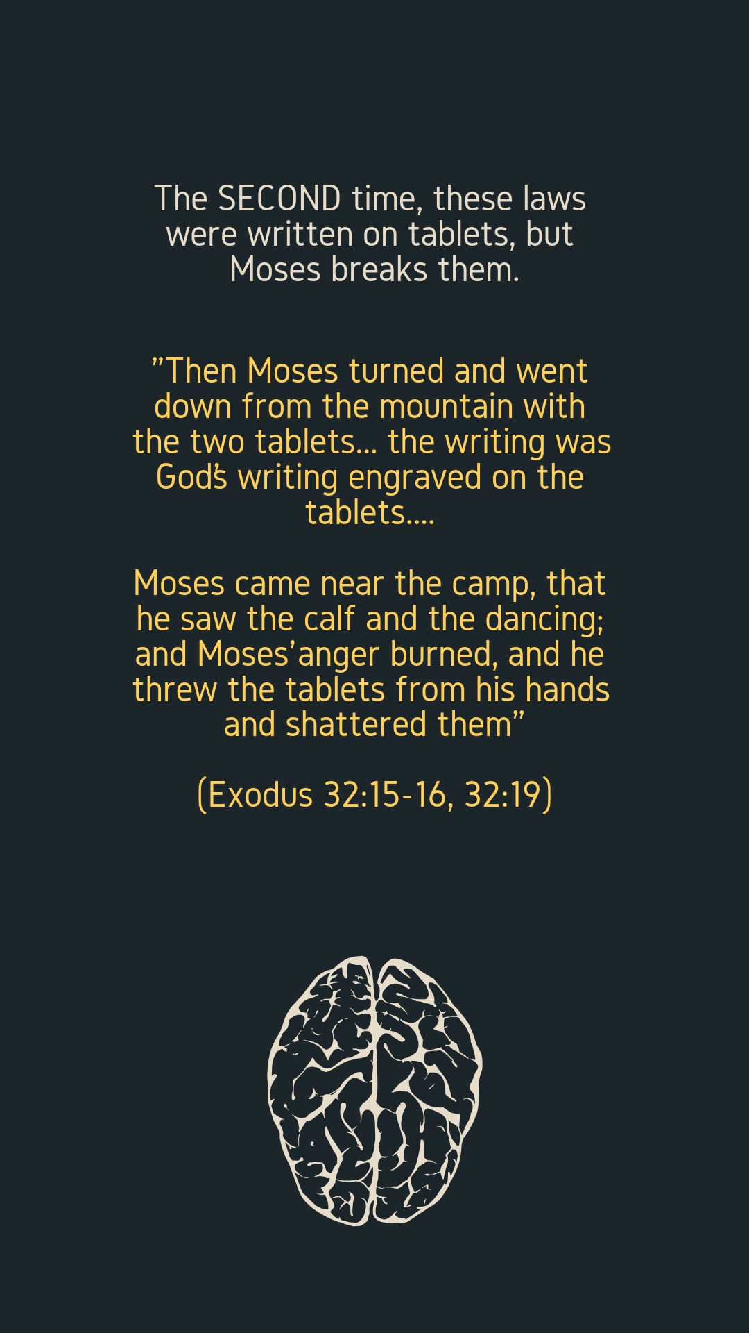 The second time, these laws were written on tablets, but Moses breaks them.
