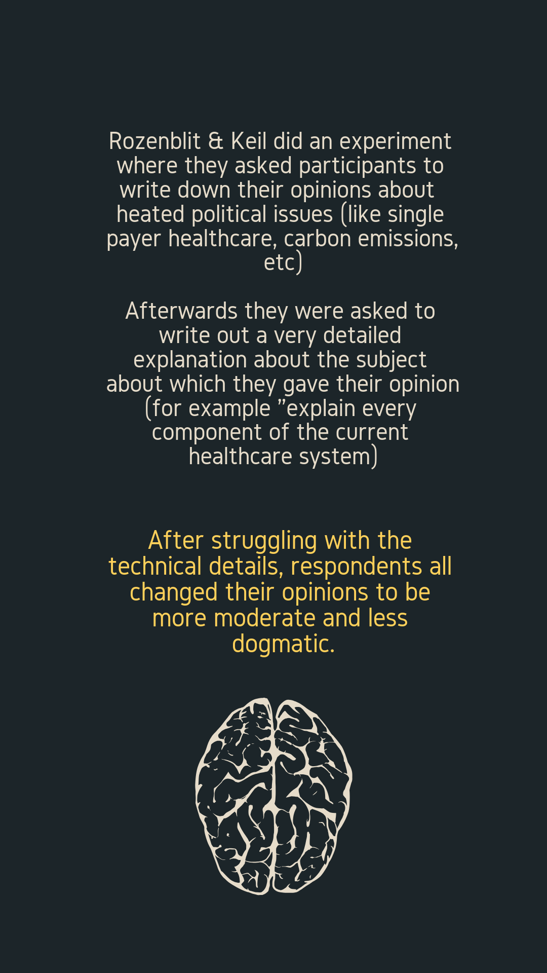 Rozenblit & Keil did an experiment where they asked participants to write down their opinions about heated political issues (like single payer healthcare, carbon emissions, etc)