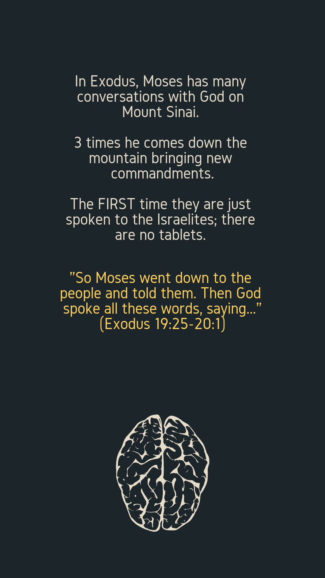 In Exodus, Moses has many conversations with God on Mount Sinai. 3 times he comes down the mountain bringing new commandments.