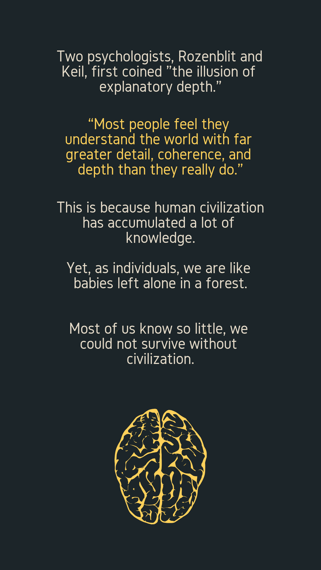 This is because human civilization has accumulated a lot of knowledge. Yet, as individuals, we are like babies left alone in a forest. Most of us know so little, we could not survive without civilization.