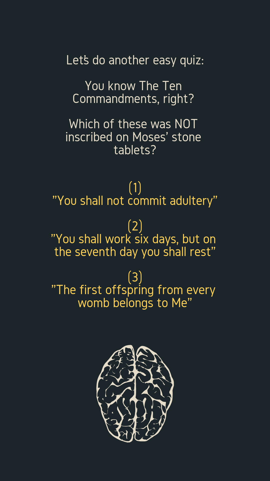 You know The Ten Commandments, right? Which of these was NOT inscribed on Moses’ stone tablets?