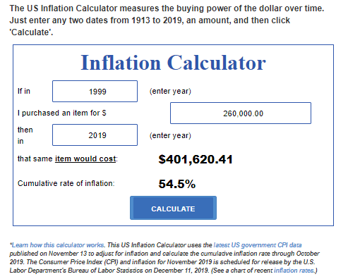 But here is where things get tricky, because over time the dollars loses its purchasing power. It takes more money to buy the same thing, whether that’s food, clothing, or an employees time. If the dollar is worth less, then it takes more of them to buy anything and everything. That rosy $260,000 house you remember? In today’s dollars - which are worth less - that’s equivalent to $401,000. Here is another way of thinking about it: when houses cost $260,000, you could have also bought 260,000 snickers bars for your $260,000. Today to buy the same number of snickers bars, you need to spend $401,000.