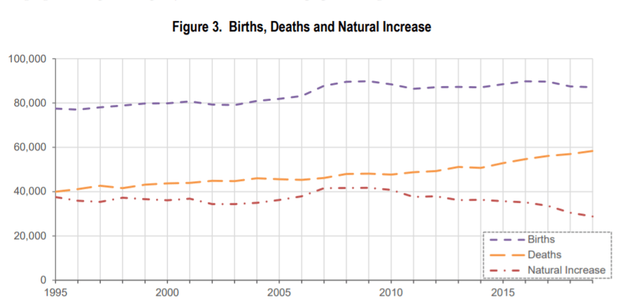 As the Seattle baby boomer population ages, we are seeing larger rates of deaths, while the number of births begins to plateau and even decrease. Our natural population growth is slowing down. Projecting out at this rate, in 60 years, more people will die than are born.
